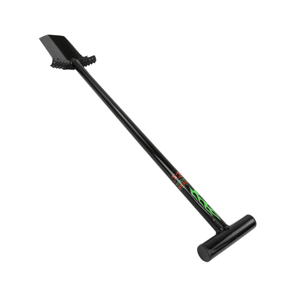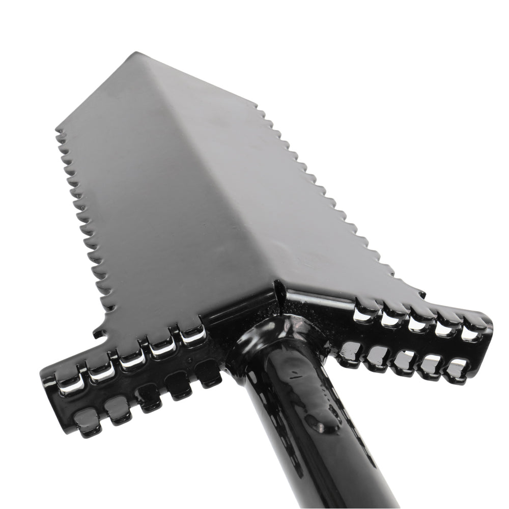 This shovel is made from tempered steel and heat treated for durability. The 36" shovel is powder coated black and the 9" blade has teeth on each side to cut roots. The handle is made to fit a standard 5.5" shovel holster. Also includes a built-in, double-sided bottle opener! Made in the USA.