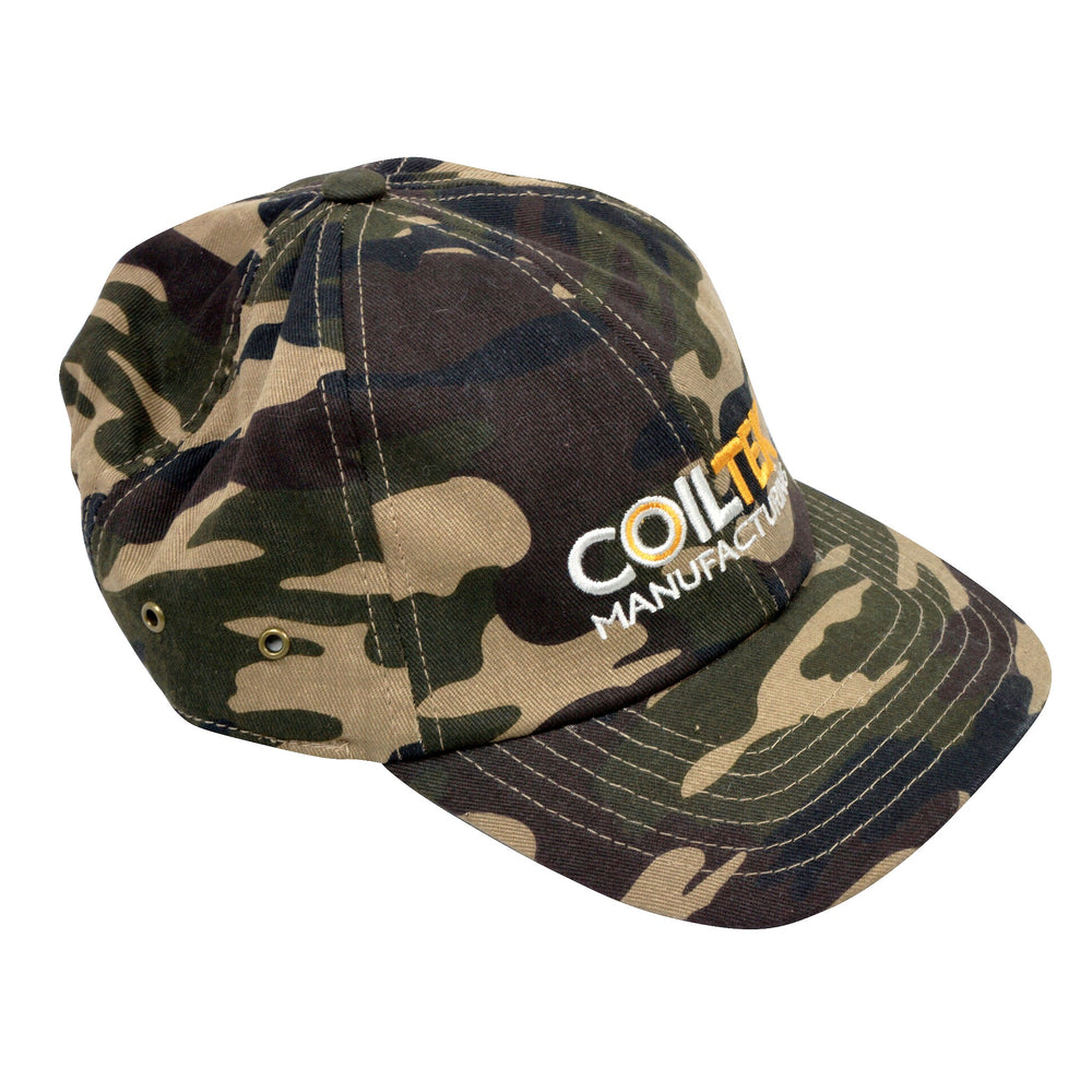 Custom, machine embroidered baseball cap with high quality camo pattern and one size fits all closure.