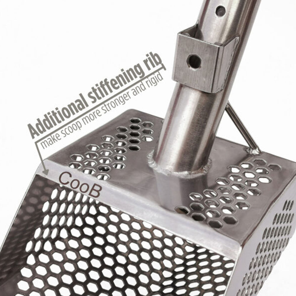 CooB 9" x 5.1" Stainless Steel Sand Scoop - Hexagon Holes - Your Gateway to Uncover Hidden Treasures! Discover ancient coins and exquisite jewelry with ease using our sand scoop. Designed with precision, this scoop features hexagon-shaped holes (7mm) for efficient sifting, ensuring no valuable artifact escapes your grasp.