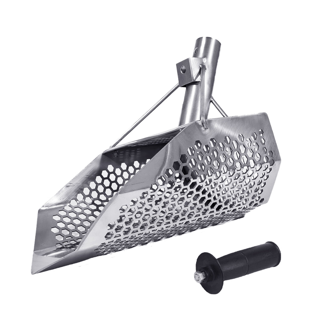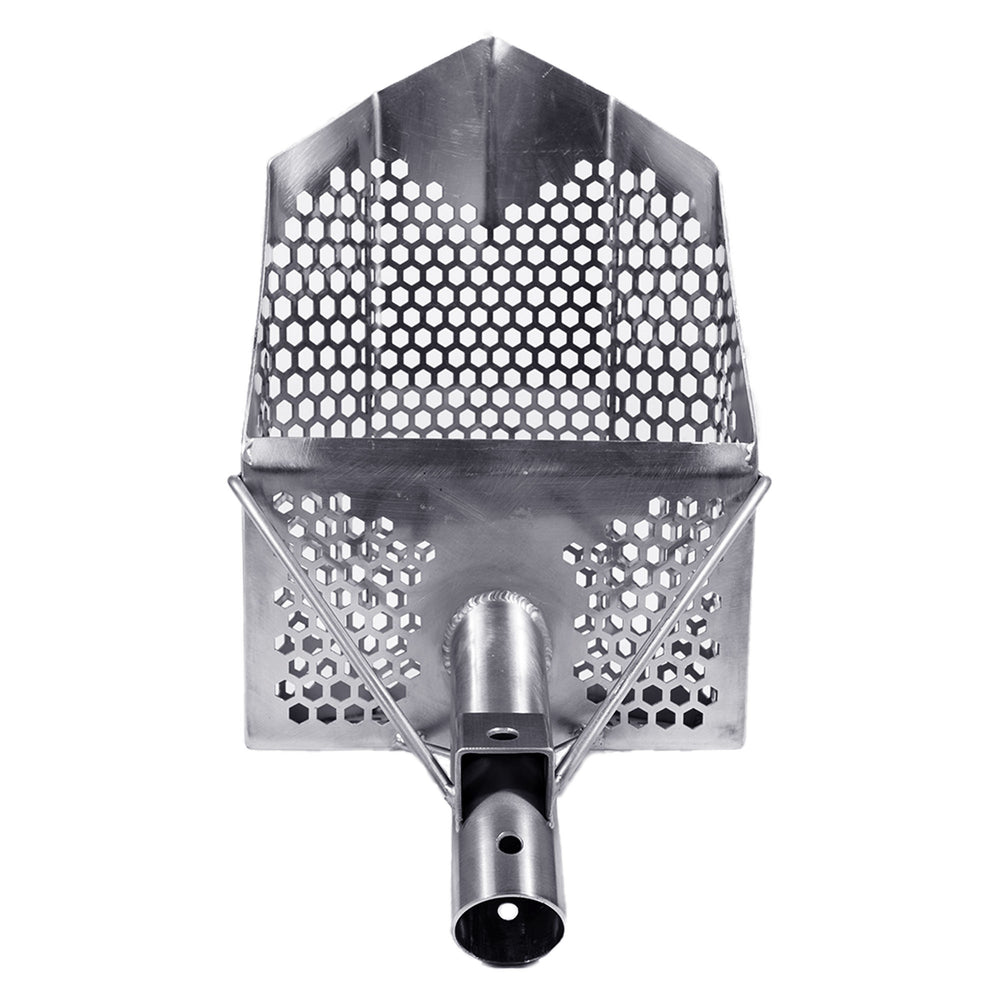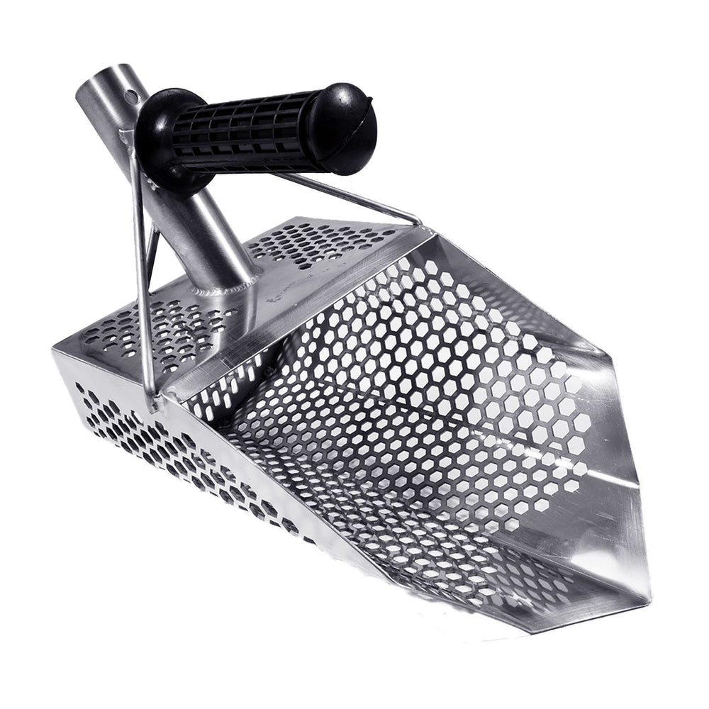 Made out of stainless steel, this scoop is designed to be effective on the beach, underwater, and surf. The stainless steel. 1.5 AISI 304 (08Х18Н10) can easily be welded and it shows high characteristics of corrosion resistance in aggressive environments. It's adaptable going through coarse and dry sand, pebbles, and other rough areas. It's is also excellent for a tough job in the water with extreme ground conditions: clay and silt, clogged sand with shells and stones, etc. The holes are cut with a laser machine into 5mm, 7mm, and 9mm apart to be designed to find small ancient coins and the finest jewelry and keep it secured inside the scoop. The nose of the scoop has a reinforced, sharpened shape which allows you to perform an aggressive but simple digging. There is an improved fixation on the top of the tube, so it will fit your rod and handle securely. Additional stiffening rib has been added to make the scoop more durable and rigid. The back wall is made stingy angle that provides convenience to stop foot and reduces the load on the hands.
