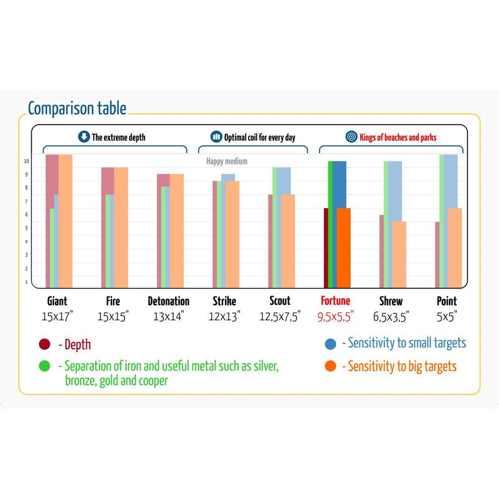 This coil is light and has excellent maneuverability, it is recommended for use on the beach, foundations of destroyed buildings, attics, wells and tunnels. This coil has good sensitivity to large, medium and especially small targets.