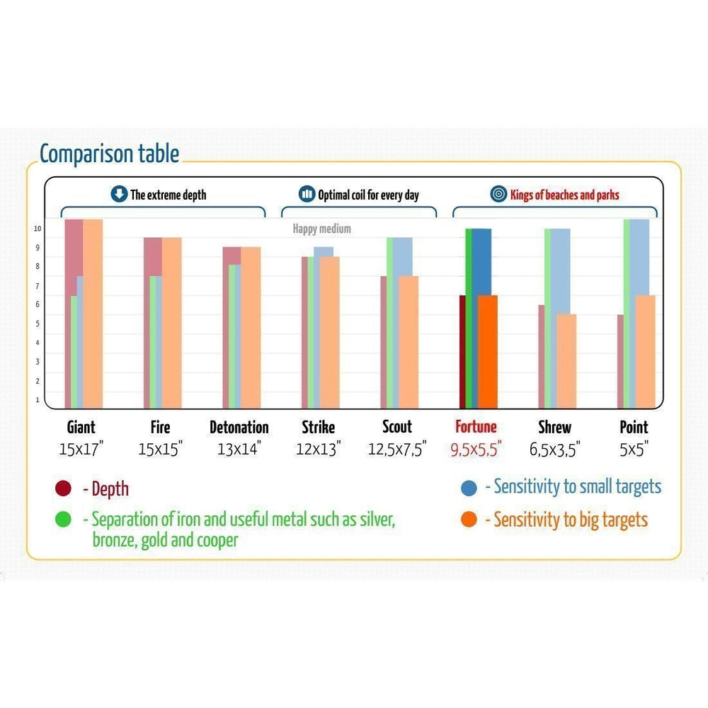 This waterproof coil is designed to search on land heavily littered with iron and other debris. The shape of the coil helps to separate nonferrous metal from iron. The Fortune coil is light and has excellent maneuverability, and is recommended for use on the beach, foundations of destroyed buildings, attics, wells and tunnels.