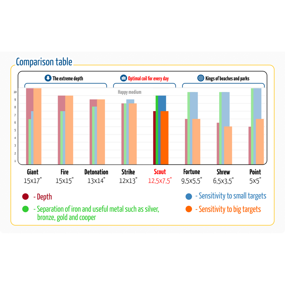 This waterproof coil is especially suited to search land heavily littered with iron, such as cities, beaches and parks. The Scout coil is unusually light for its size, which makes it easy to search for a whole day.
