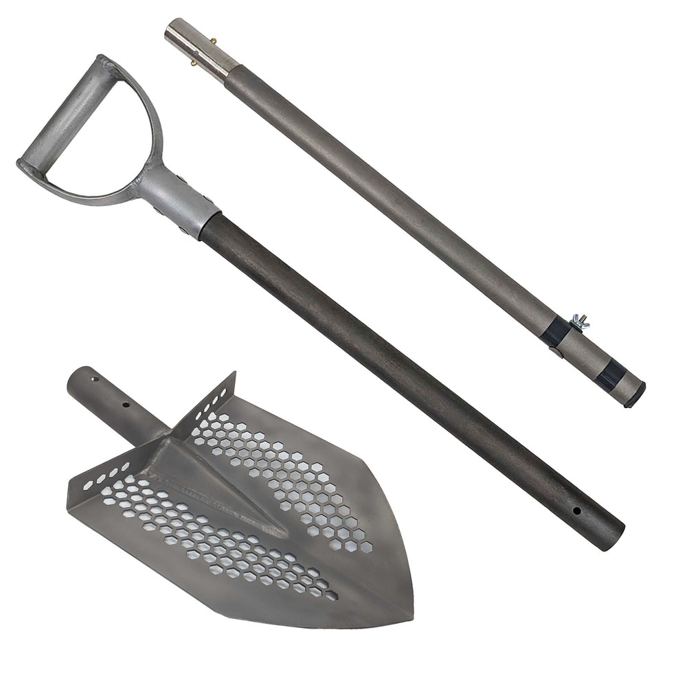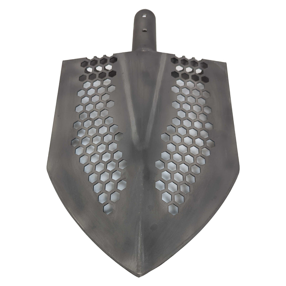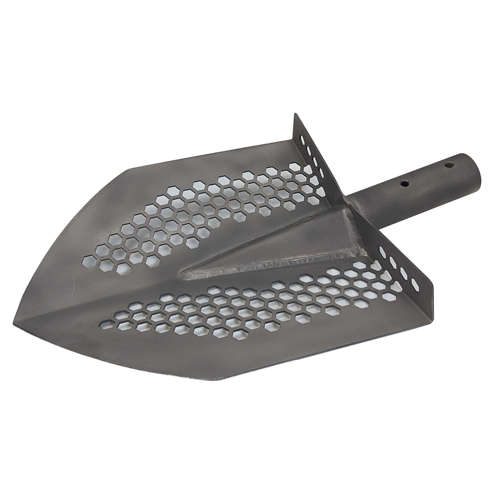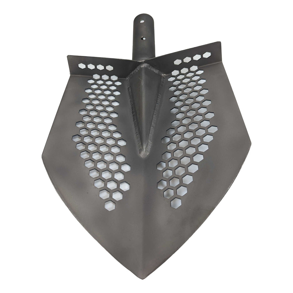 Made out of titanium (1.5mm), it is designed to be easily welded and has a high resistance against corrosion in aggressive environments. The hexahedron holes are cut 10mm apart with a laser machine to be designed to find small ancient coins and the finest jewelry and keep it secured inside the scoop. The front part has a reinforced, sharpened shape which allows you to perform an aggressive but simple digging.