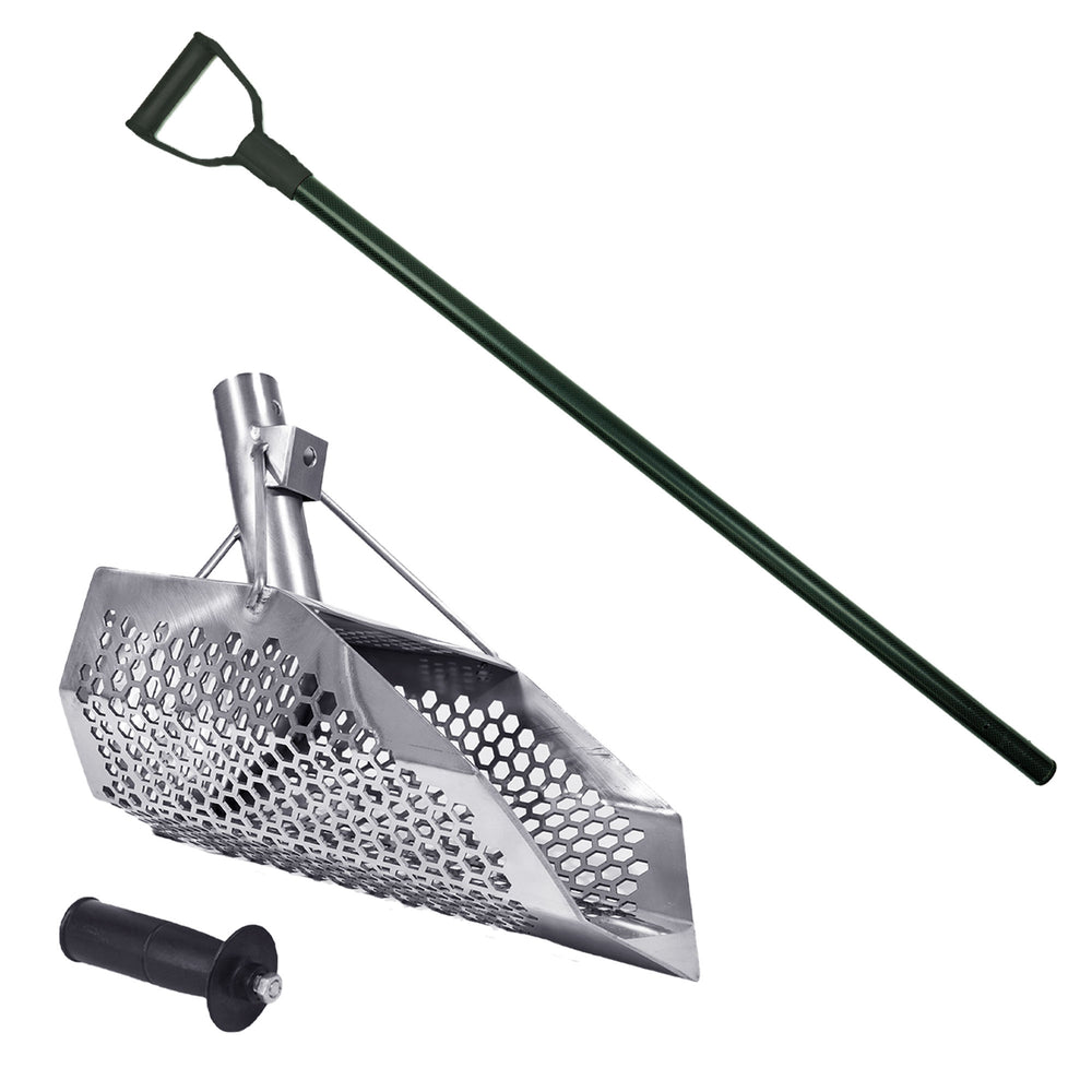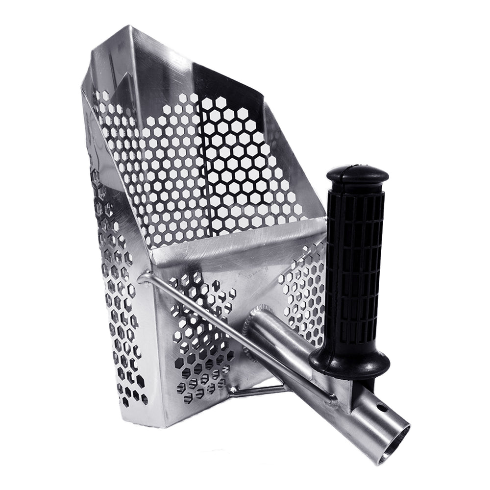 Made out of stainless steel, this scoop is designed to be effective on the beach, underwater, and surf. The stainless steel. 1.5 AISI 304 (08Х18Н10) can easily be welded and it shows high characteristics of corrosion resistance in aggressive environments. It's adaptable going through coarse and dry sand, pebbles, and other rough areas. It is also excellent for a tough job in the water with extreme ground conditions: clay and silt, clogged sand with shells and stones, etc. The holes are cut with a laser machine into 5mm, 7mm, and 9mm apart to be designed to find small ancient coins and the finest jewelry and keep it secured inside the scoop. The nose of the scoop has a reinforced, sharpened shape which allows you to perform an aggressive but simple digging. There is an improved fixation on the top of the tube, so it will fit your rod and handle securely. Additional stiffening rib has been added to make the scoop more durable and rigid. The back wall is made stingy angle that provides convenience to stop foot and reduces the load on the hands.