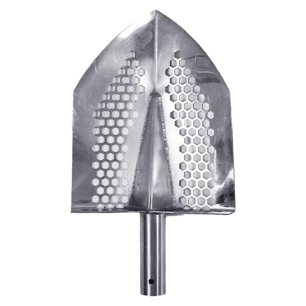 Made out of stainless steel (2.0mm), it is designed to be easily welded and has a high resistance against corrosion in aggressive environments. The hexahedron holes are cut 10mm apart with a laser machine to be designed to find small ancient coins and the finest jewelry and keep it secured inside the scoop. The front part has a reinforced, sharpened shape which allows you to perform an aggressive but simple digging.