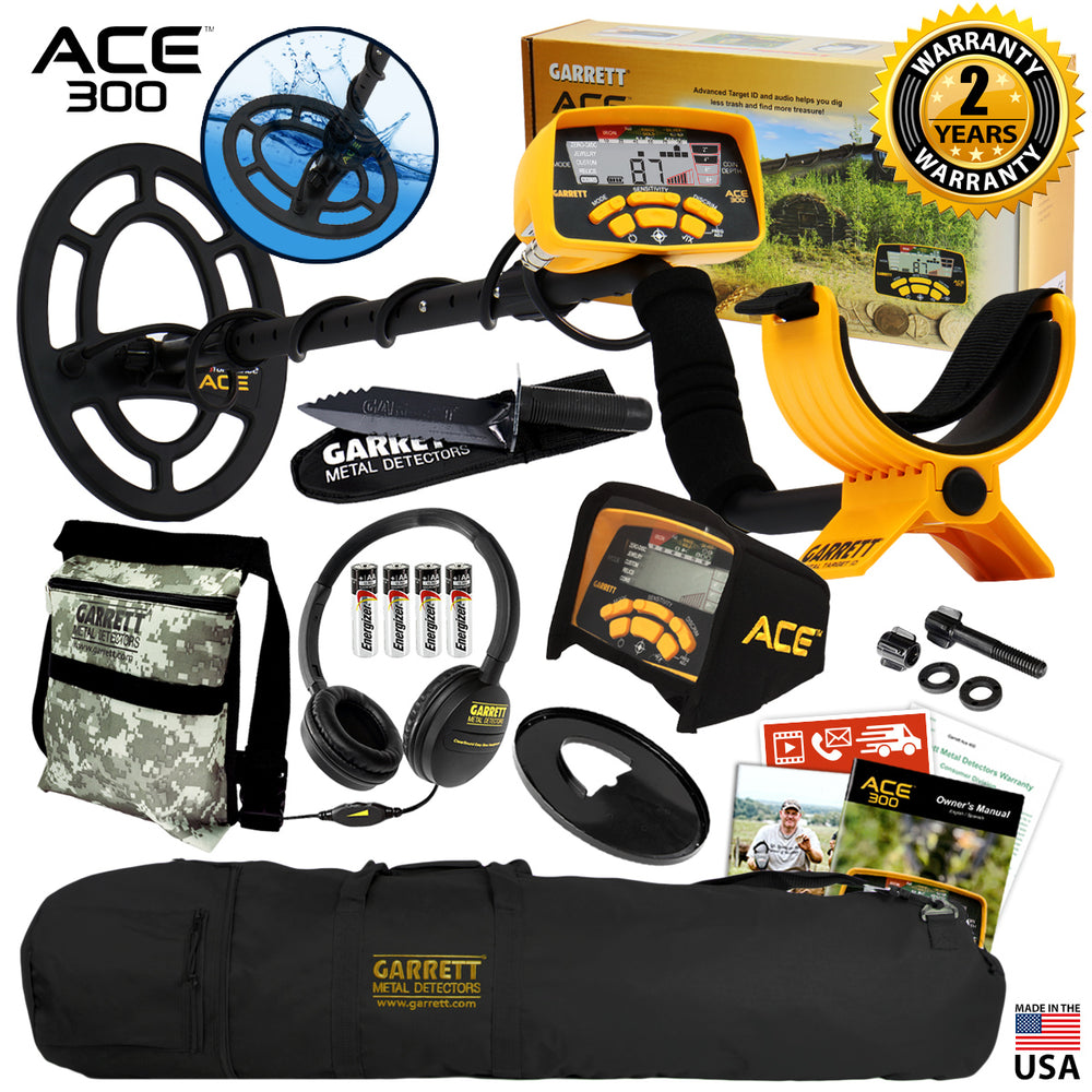 Garrett ACE 300 Metal Detector with 7″ x 10″ PROformance Waterproof Submersible Search Coil, Waterproof Coil Cover, ClearSound Headphones, Garrett Edge Digger, Garrett Carry Bag, Garrett Camo Finds Pouch, ACE Environmental Cover Up for control box, Batteries and a Two-Year Warranty.
