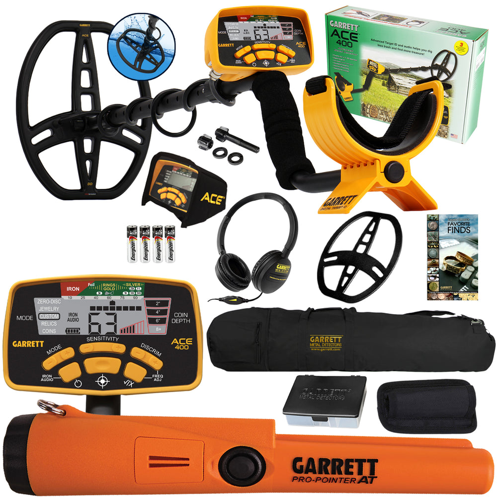 Garrett ACE 400 Metal Detector Special with Pro-Pointer AT pinpointer, "Keepers" finds box, Vaughan Garrett's Favorite Finds book, and Garrett all-purpose metal detector carry bag.