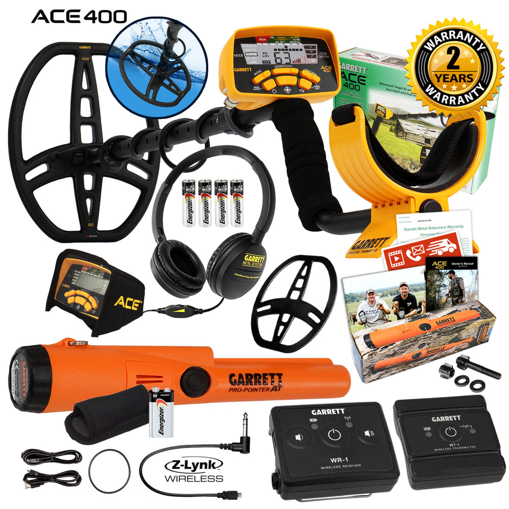 Garrett ACE 400 Metal Detector with 8.5″ x 11″ PROformance DD Waterproof Submersible Search Coil, Coil Cover, ClearSound Headphones, ACE Environmental Cover Up, Adjustable Arm Strap, Batteries and a Two-Year Warranty.