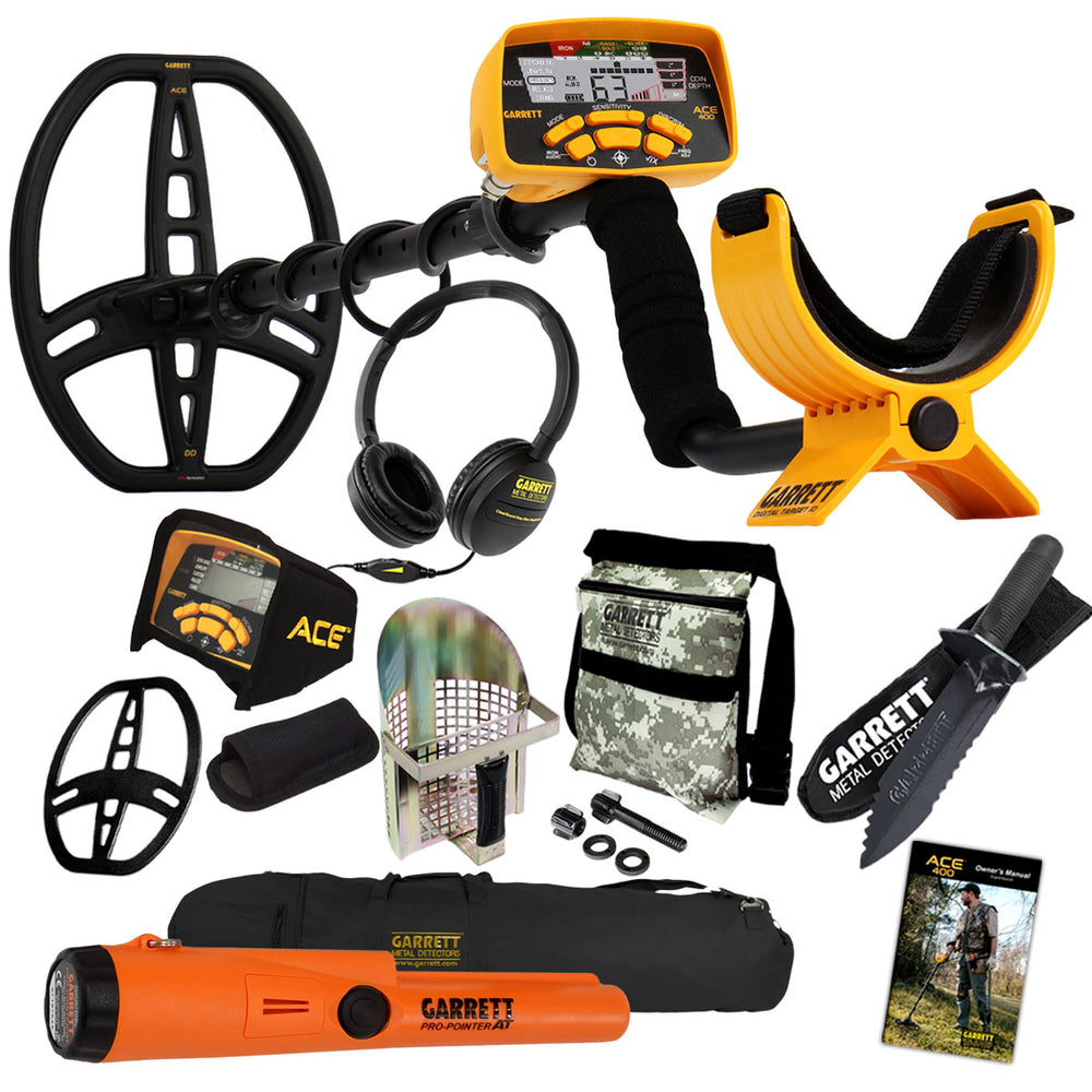 Garrett ACE 400 Metal Detector with 8.5″ x 11″ PROformance DD Waterproof Submersible Search Coil, Pro-Pointer AT, Coil Cover, ClearSound Headphones, Garrett ACE Environmental Cover Up, Garrett Carry Bag, Garrett Edge Digger, Camo Finds Bag, Metal Sand Scoop, Batteries and a Two-Year Warranty.