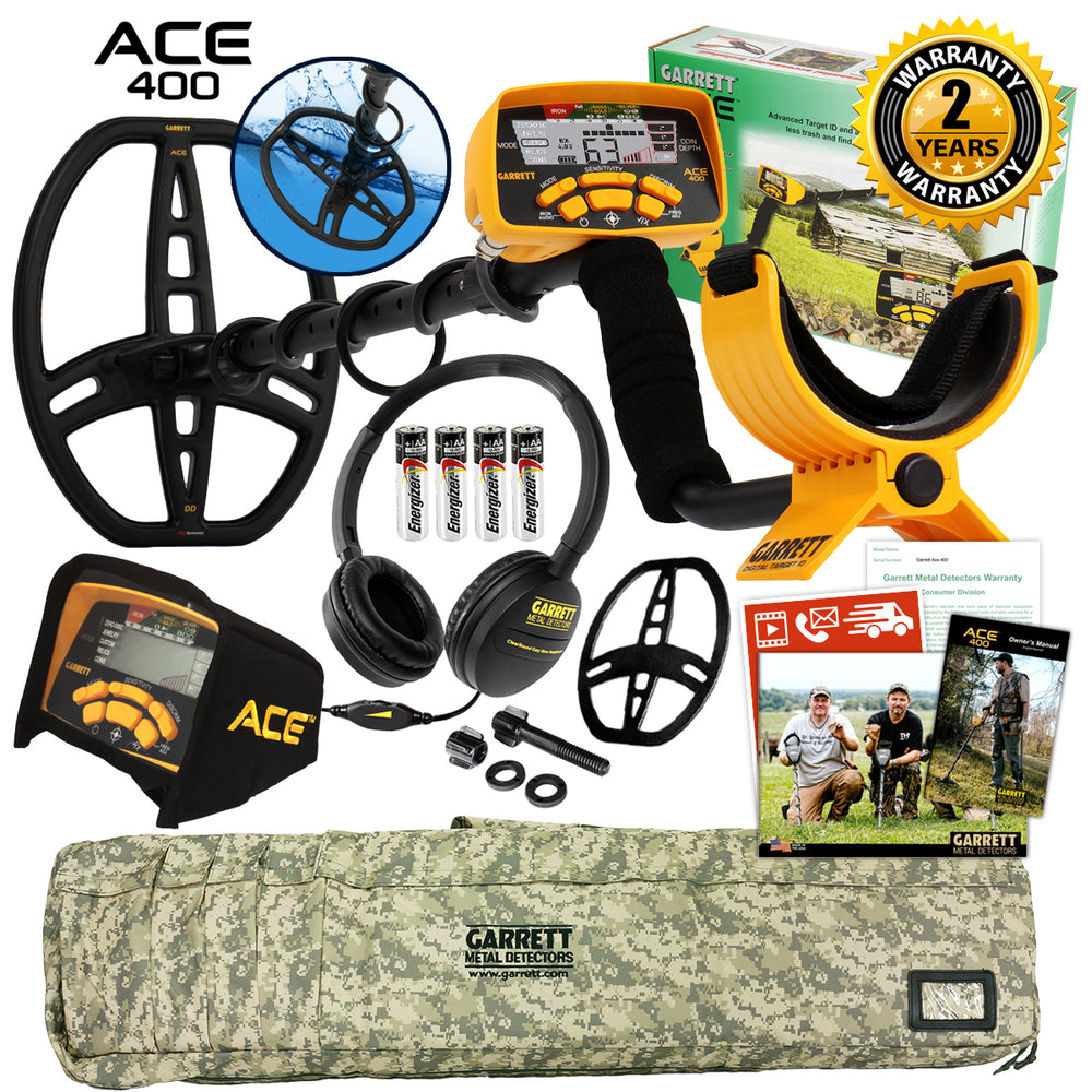 Garrett ACE 400 Metal Detector with 8.5″ x 11″ PROformance DD Waterproof Submersible Search Coil, Waterproof Coil Cover, Garrett Soft Case Camouflage Padded Carry Bag, ClearSound Headphones, Garrett ACE Environmental Cover Up, Adjustable Arm Strap, Batteries and a Two-Year Warranty.
