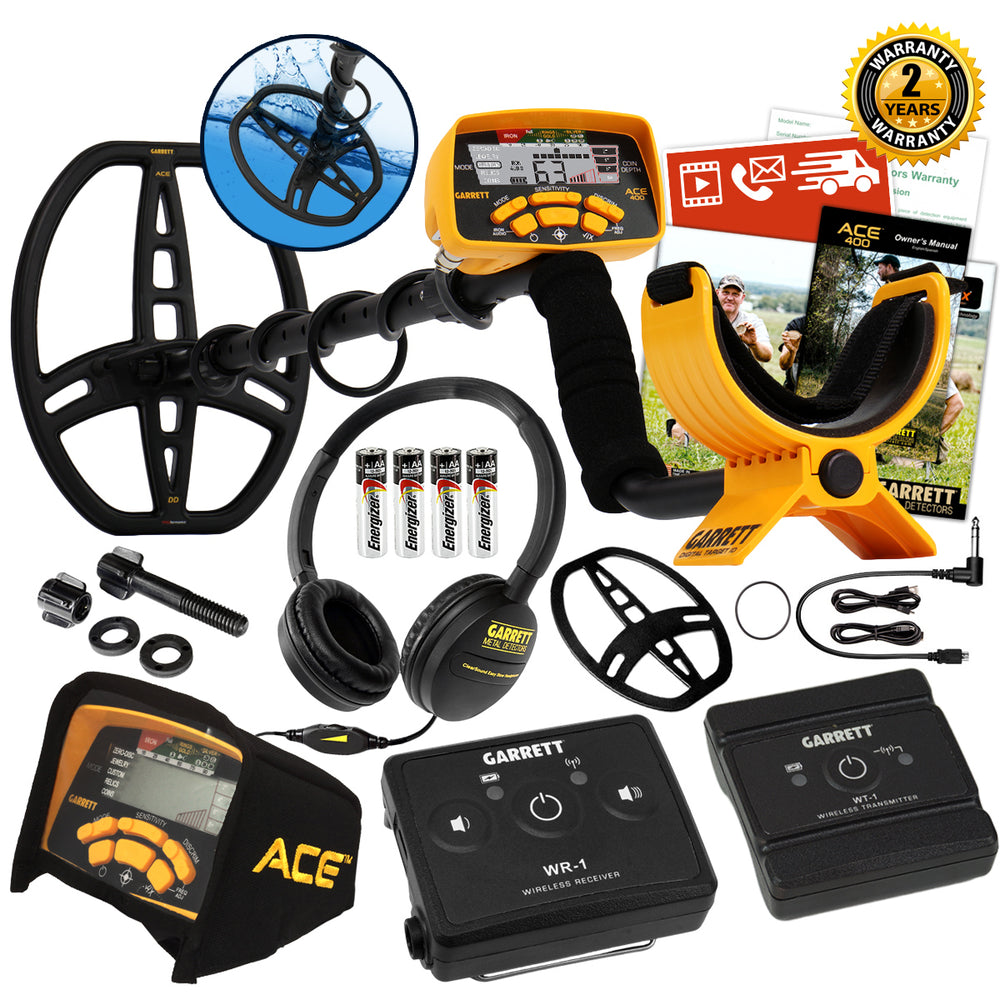 Garrett ACE 400 Metal Detector with 8.5″ x 11″ PROformance DD Waterproof Submersible Search Coil, Coil Cover, ClearSound Headphones, ACE Environmental Cover Up, Adjustable Arm Strap, Batteries and a Two-Year Warranty.