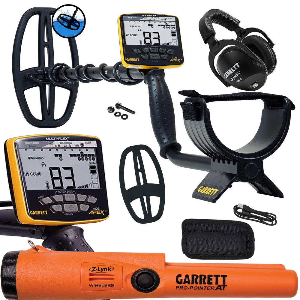 This is the new leader in affordable metal detector technology, the Garrett ACE APEX Multi Frequency Metal Detector. This upgraded package comes with the Z-Lynk Wireless Headphones and a Coil Cover for the Viper Multi-Flex Search Coil.