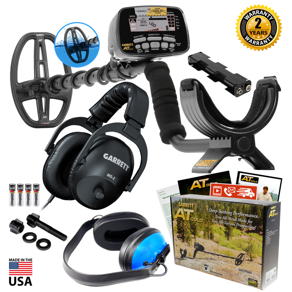 Garrett AT Gold Metal Detector with 5"x8" PROformance DD Submersible Search Coil, Coil Cover, Garrett MasterSound 2 Headphones, Garrett Waterproof Submersible Headphones, Batteries and a Two-Year Warranty.