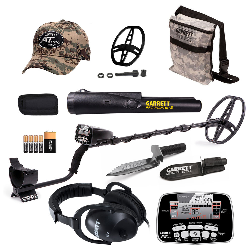 Garrett AT Pro Waterproof Metal Detector with ProPointer II and Bonus Pack - 8.5″ x 11″ PROformance DD submersible Search Coil, Coil Cover, MS-2 Headphones, Diggers Pouch, AT Pro Ballcap, Pro-Pointer II, Batteries and a Two-Year Warranty.