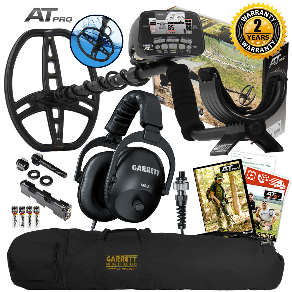 Garrett AT Pro Metal Detector Special with 8.5″ x 11″ PROformance DD Waterproof Search Coil, 8.5" x 11" Waterproof Coil Cover, Garrett All-Purpose Carry Bag, Master Sound 2 Headphones, Batteries and a Two-Year Warranty.