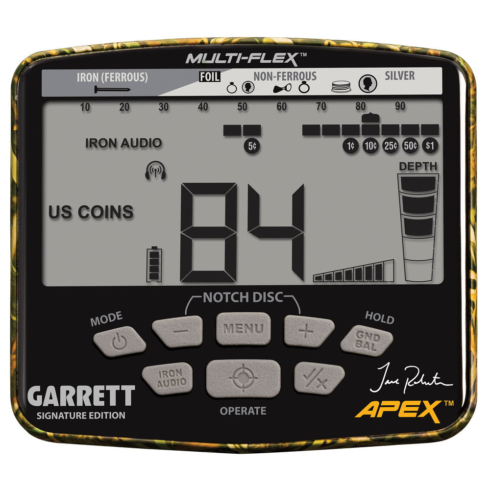 The APEX Metal Detector is the Pinnacle of Multi-Frequency Detection Flexibility. Fueled by a cutting-edge, broad-bandwidth digital platform, the Apex's Multi-Flex frequency technology lets you choose between powerful single frequencies to enhance detection of larger, more conductive targets or simultaneous multifrequency modes for better detection of smaller, less conductive targets. Contained in a sleek control box, the detector's intuitive controls feature direct drive buttons for the most frequently used controls and easy-access menu adjustments for the other controls. Built to help you find what you want to find, this advanced system offers 8 levels of iron volume adjustment, 6 detection modes, and a pinpoint mode, 175 points of ground balance resolution, audible target ID with 5 distinct tones, high-resolution notch discrimination, and 8 levels of sensitivity/depth adjustment. A backlit LCD display with large target ID numbers makes it easy to monitor progress. This high-performance system comes with a lightweight and waterproof 8.5" x 11" DD Multi-Flex Raider Searchcoil. A low-impedance, broad-bandwidth coil made to support the Multi-Flex frequency technology, the Raider’s larger size provides greater detection depth and coverage. The built-in rechargeable lithium-ion battery offers up to 15 hours of use and comes with a Micro-USB charging cable. The Apex is lightweight and well-balanced at only 2.5 pounds, so you can go coin shooting, relic hunting, shallow water wading, beach hunting, and even prospecting for hours!