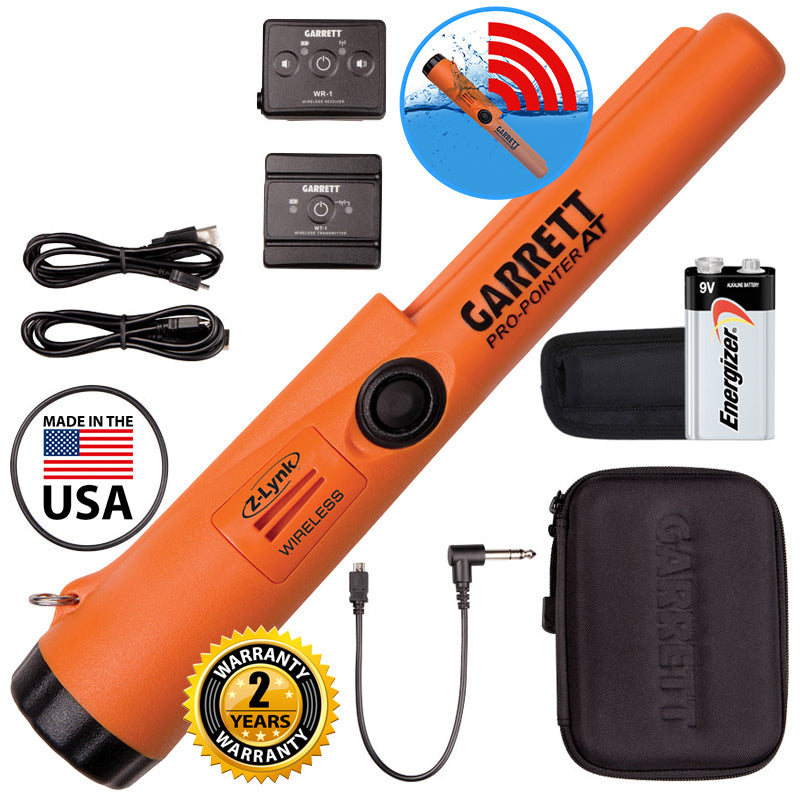 The Garrett Pro Pointer AT Z-Lynk waterproof Pinpointer with the MS-3 Headphones, Transmitter, Receiver, Woven Belt Holster for the pro-pointer, 9 volt Battery and a Two-Year Warranty.