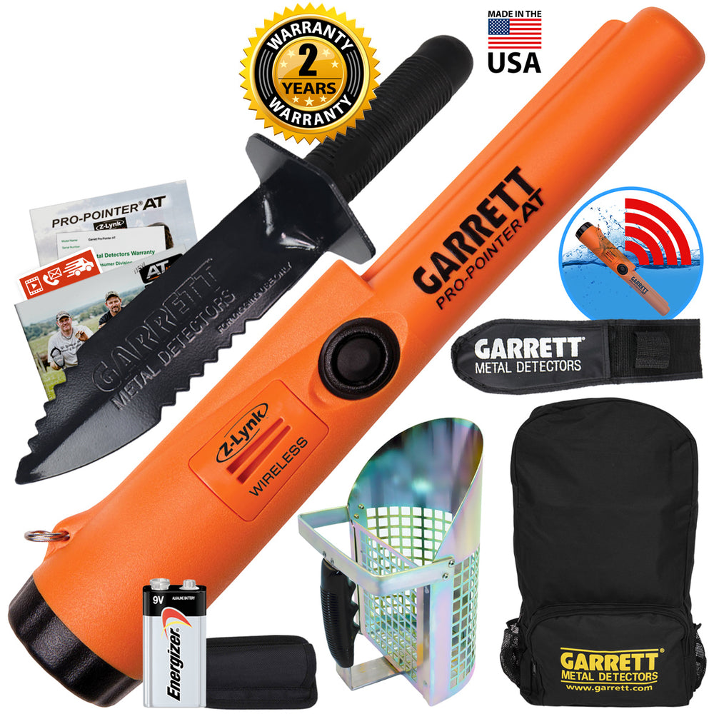 Garrett Pro Pointer AT Z-LYNK Waterproof Pinpointer bundle with Pro Pointer AT Z-LYNK, woven Belt Holster, Backpack, Edge Digger, Anodized Scoop, 9v battery, and a Two-Year Warranty.