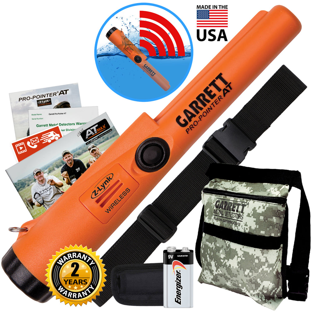 TheGarrett Pro Pointer AT Z-LYNK waterproof Pinpointer bundle with the Garrett Camo Finds Pouch, Garrett WEB Belt, Woven Belt Holster for the pro-pointer, 9 volt Battery and a Two-Year Warranty.