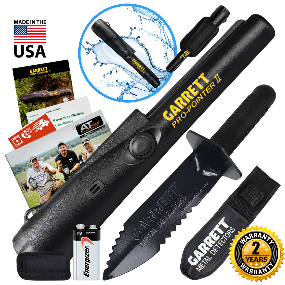 Garrett Pro-Pointer II pinpointer with the Garrett Edge Digger knife, Sheath for the Edge Digger, Woven Belt Holster, 9 volt battery and a Two-Year Warranty.