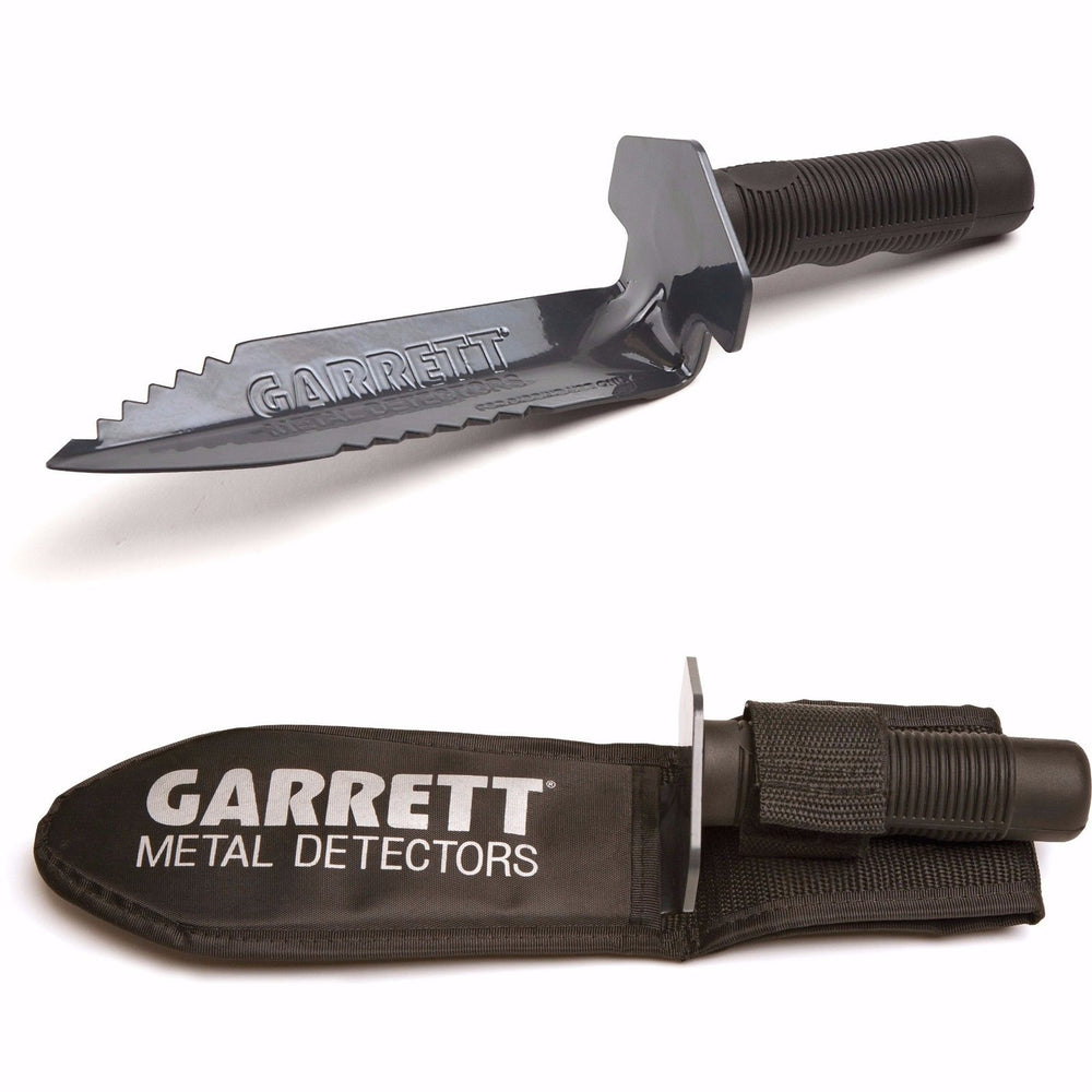Garrett ProPointer AT Waterproof Pinpointer bundle with Garrett Edge Digger & Sheath, Garrett Camo Pouch, Garrett Backpack, Woven Belt Holster, 9v Battery, and a Two-Year Warranty.