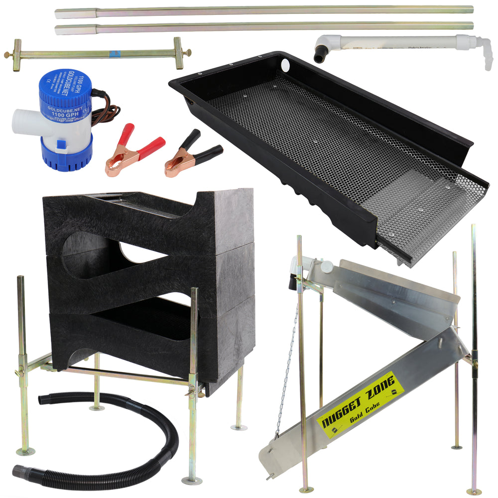 Gold Cube 3 Stack Deluxe Complete Gold Prospecting Kit with 1 Slick Plate, 2 Separator Trays, Stand, Pump, Hose, and Hose Adapters.