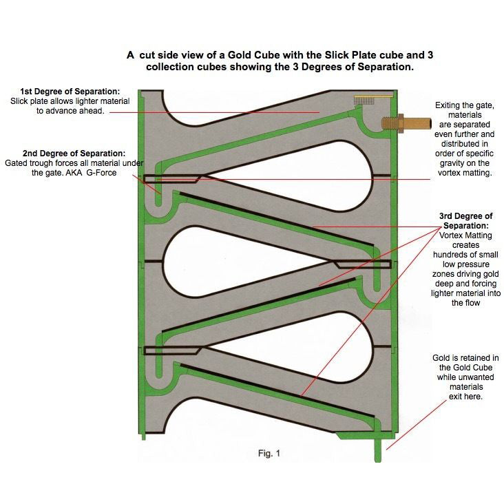 Move an amazing amount of material through the Gold Cube, up to 1,000 lbs. an hour! Active Vortex Zones gravitate the heavy gold downward thus forcing out lighter materials. Self-cleaning, and easy to use.