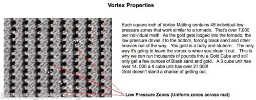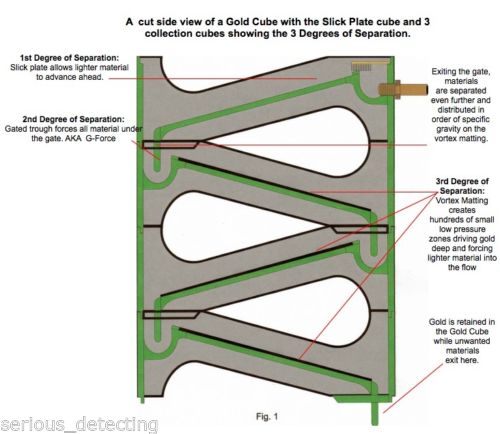 Move an amazing amount of material through the Gold Cube, up to 1,000 lbs. an hour! Active Vortex Zones gravitate the heavy gold downward thus forcing out lighter materials. Self-cleaning, and easy to use.