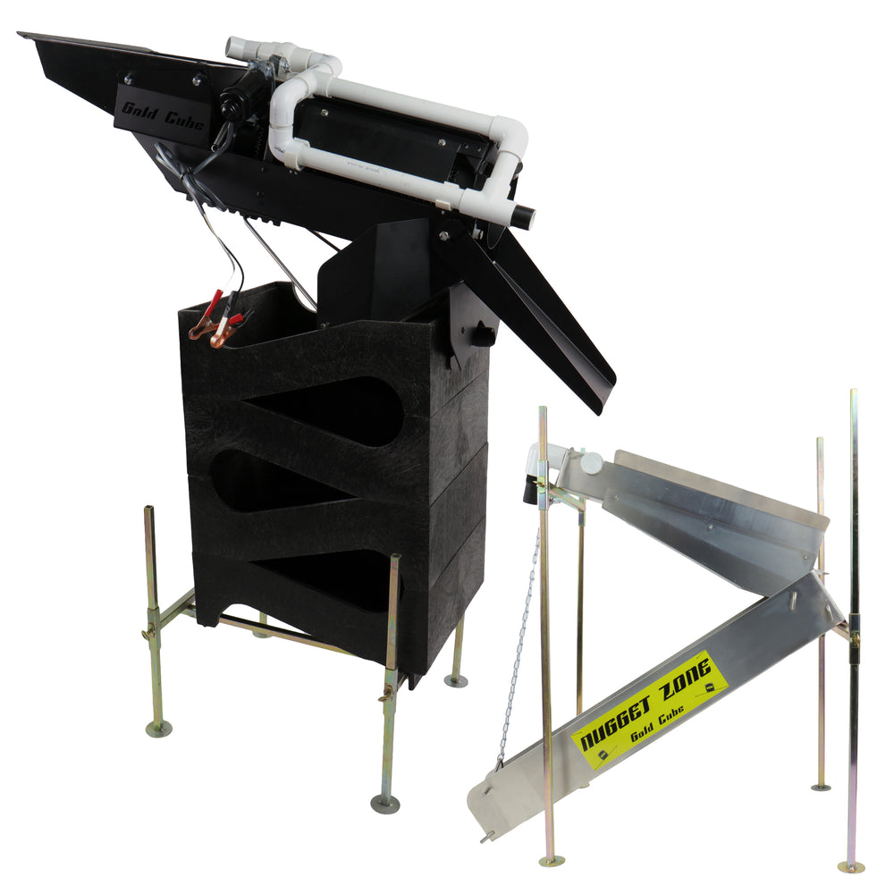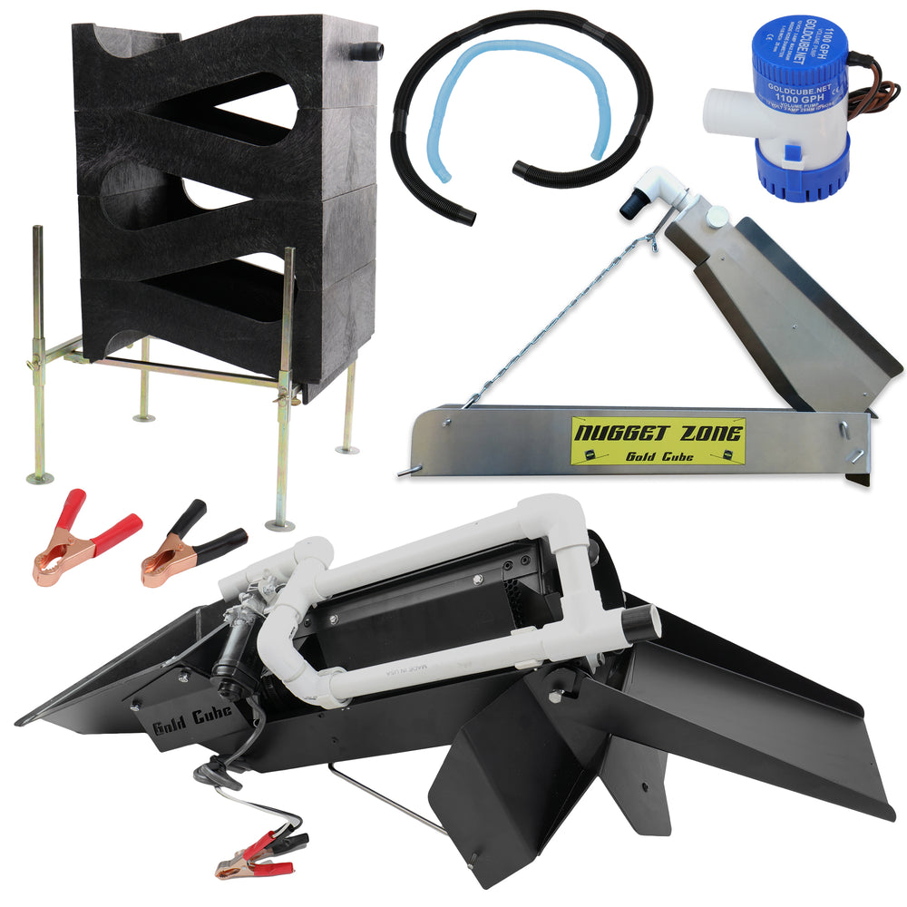 Gold Cube 4 Stack Deluxe Complete Gold Prospecting Kit with 1 Slick Plate, 3 Separator Trays, Stand, Pump, Hose, and Hose Adapters.