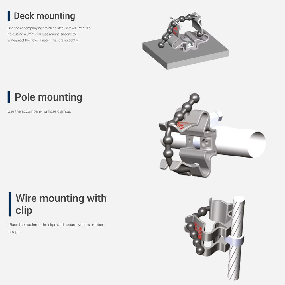 To ensure your hook is always ready when you need it, our innovative mounting clips offer the perfect solution. Designed for versatility, these clips can be securely fastened to a deck, pole, or wire, providing a reliable and convenient storage option. With easy installation, the mounting clips keep your hook within reach, saving time and ensuring your equipment is organized and accessible whenever you're on the water