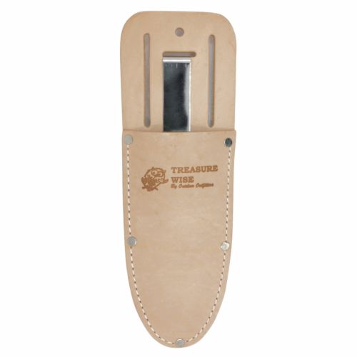 Large 11" leather sheath with clip-on spring metal clip or slots to weave a belt through (belt not included).