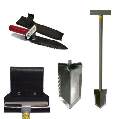 The ReadyShovel is a leather "holster" that allows you to easily snap your T-handle shovel in place on your belt and comes off just as easy when you need it. Your hand will be free of carrying your digging tool, a real plus on those daylong hunts. Perfect for metal detecting with your T-handle shovel (Lesche Sampson, etc.) by your side and not in your hand. Using your Minelab, Garrett, Whites, XP, Teknetics, Tesoro, Fisher, Bounty Hunter or any other metal detector has never been so easy.