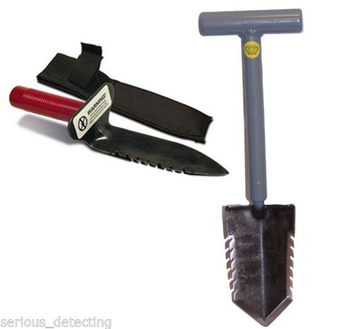 The Lesche Sampson with T-handle and Serrated Edge is a great shovel for the many different types of treasure hunting you may enjoy. The Sampson shovel is perfect for Relic Hunting, Coin and Jewelry Hunting and even Gold Prospecting. While you would not bring a shovel to a park, the Lesche Sampson Digger is great for digging in out of the way locations such as a farmer's field, an old cellar hole or a ghost town. The T-handle Lesche Sampson is both rugged and easy to use in all types of ground conditions. The Lesche Sampson Digger featured here is one of two in the series of Lesche Sampson shovels. Both are 18" long and constructed of the finest air craft quality steel making them worthy of their 5 year warranty. The model on this page features the T style handle. The other model in the series features the Ball style handle. Other than the handle, both models are identical.