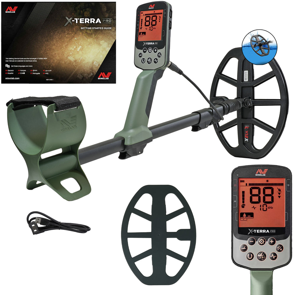 Stand out from the crowd and step up your detecting game with the all-new X-TERRA PRO treasure detector by Minelab. Out of the box, simply set your detector to match your terrain with Park, Field, and Beach Search Modes and leave all the hard work up to the detector to start unearthing the treasure you seek. As your skills improve, X-TERRA PRO offers room to grow with PRO-SWITCH (Switchable Frequency Technology), so you can set it to 5, 8, 10, or 15 kHz at the press of a button and take control of any environment or situation that comes your way. Fully IP68 waterproof to 5 m (16 ft) and loaded with features like 5 audio modes, a control pod flashlight, and handgrip vibration you'll be detecting like a pro from the moment you start swinging.