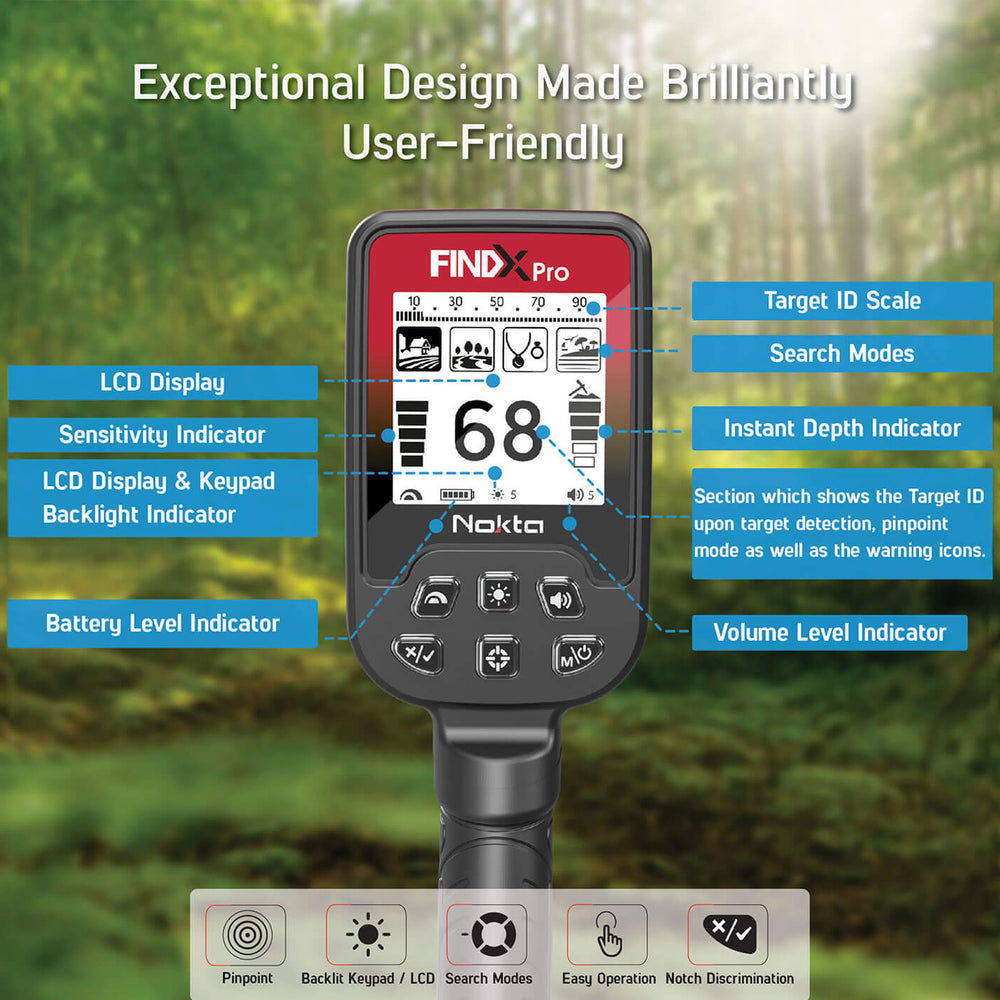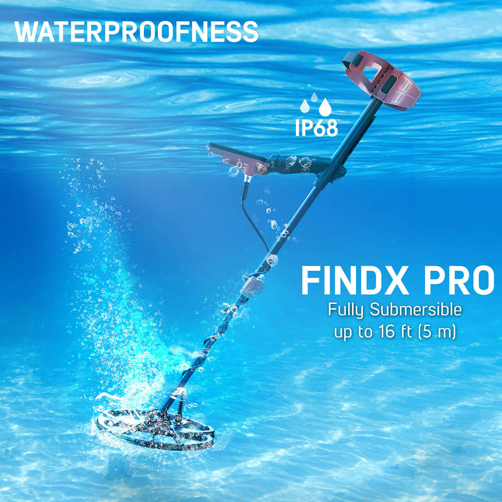 Thanks to its IP68 waterproof technology, the FINDX Pro metal detector is completely waterproof, allowing it to submerge up to 16ft(5m) underwater. Most other metal detectors you see cannot be fully submerged in water or used in the rain, but the FINDX Pro model is completely waterproof. This makes it suitable for lake, river & beach metal detecting both underwater and on land. The backlit keypad & LCD also assist you during underwater searches.