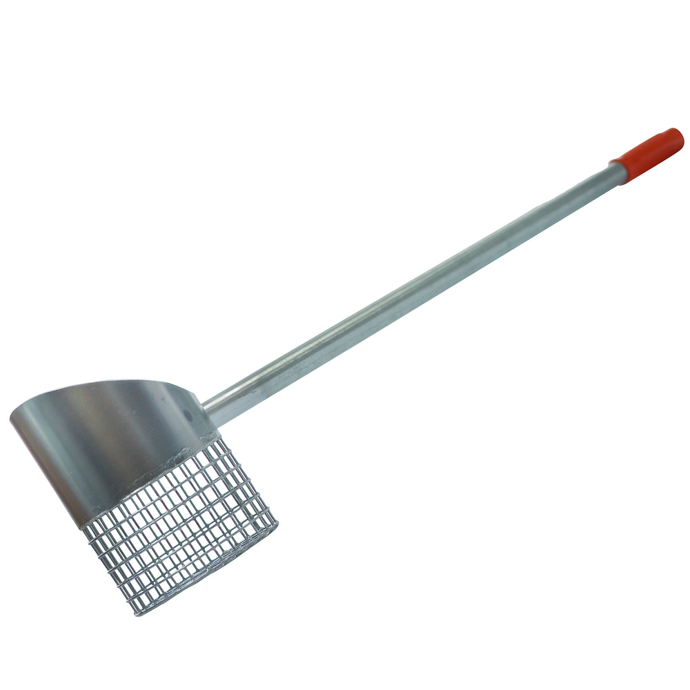 This is another popular sand scoop. It has a fixed 28" long handle. This 5" diameter sand scoop is made of 16 gauge steel and strong 1/2" wire welded screen.