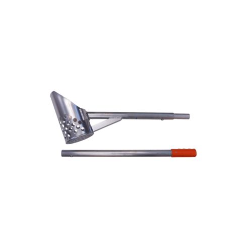 This light duty shallow water and beach scoop in “travel mode”. The aluminum bucket has 5/8" diameter holes punched into the sides and the back of the scoop.