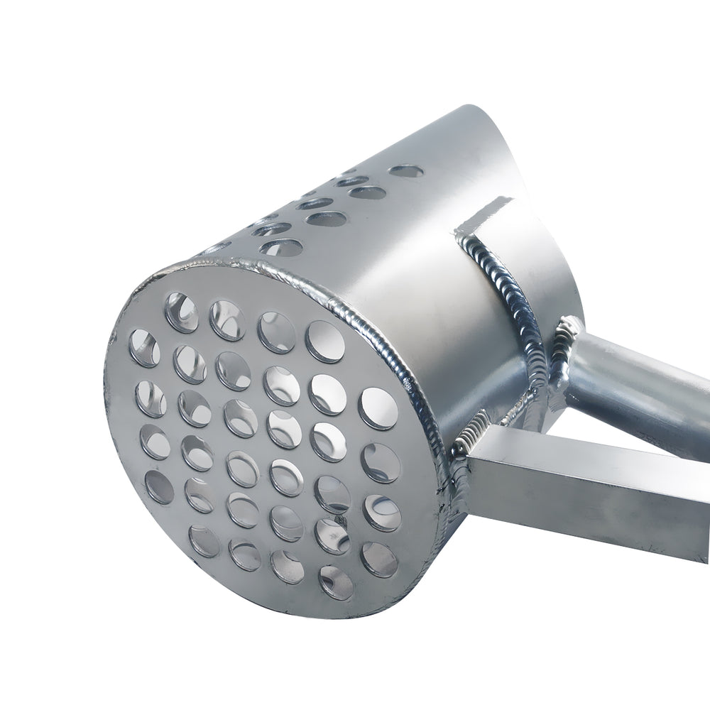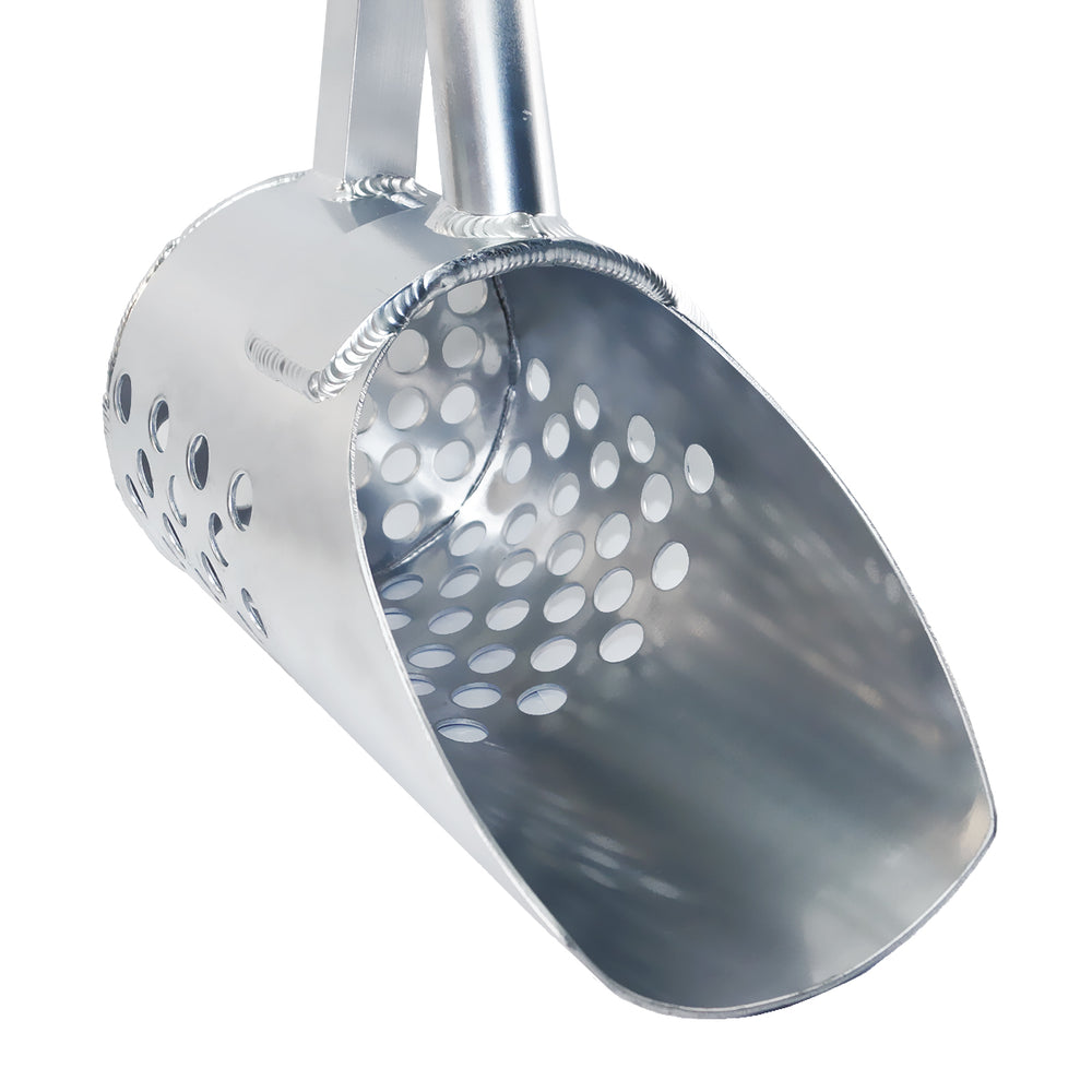 It is our lightweight shallow water and beach scoop designed for travel. The aluminum bucket has 5/8" diameter holes punched into the sides and the back of the scoop.