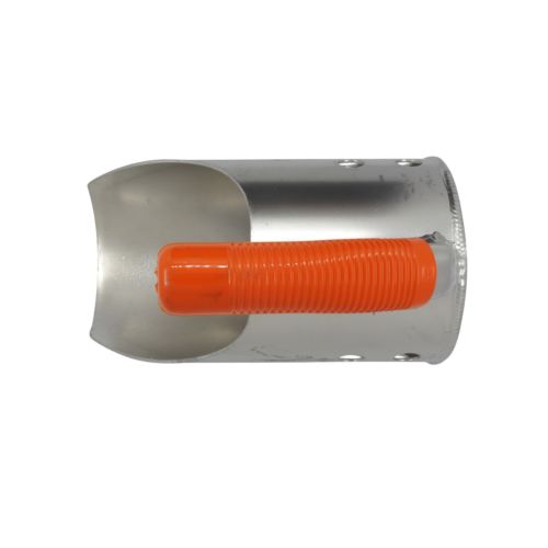 The anodized handle is welded to the top of the sand scoop. The handle has a curve in it for easy digging and has an orange rubber hand grip for comfort.