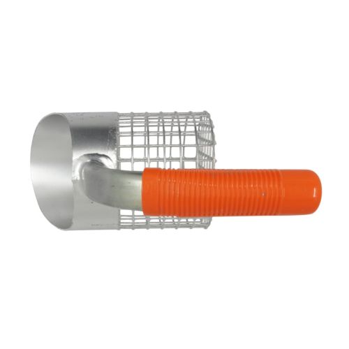 This is our durable 4" diameter sand scoop made of 16 gauge steel and strong 1/2" wire welded screen.