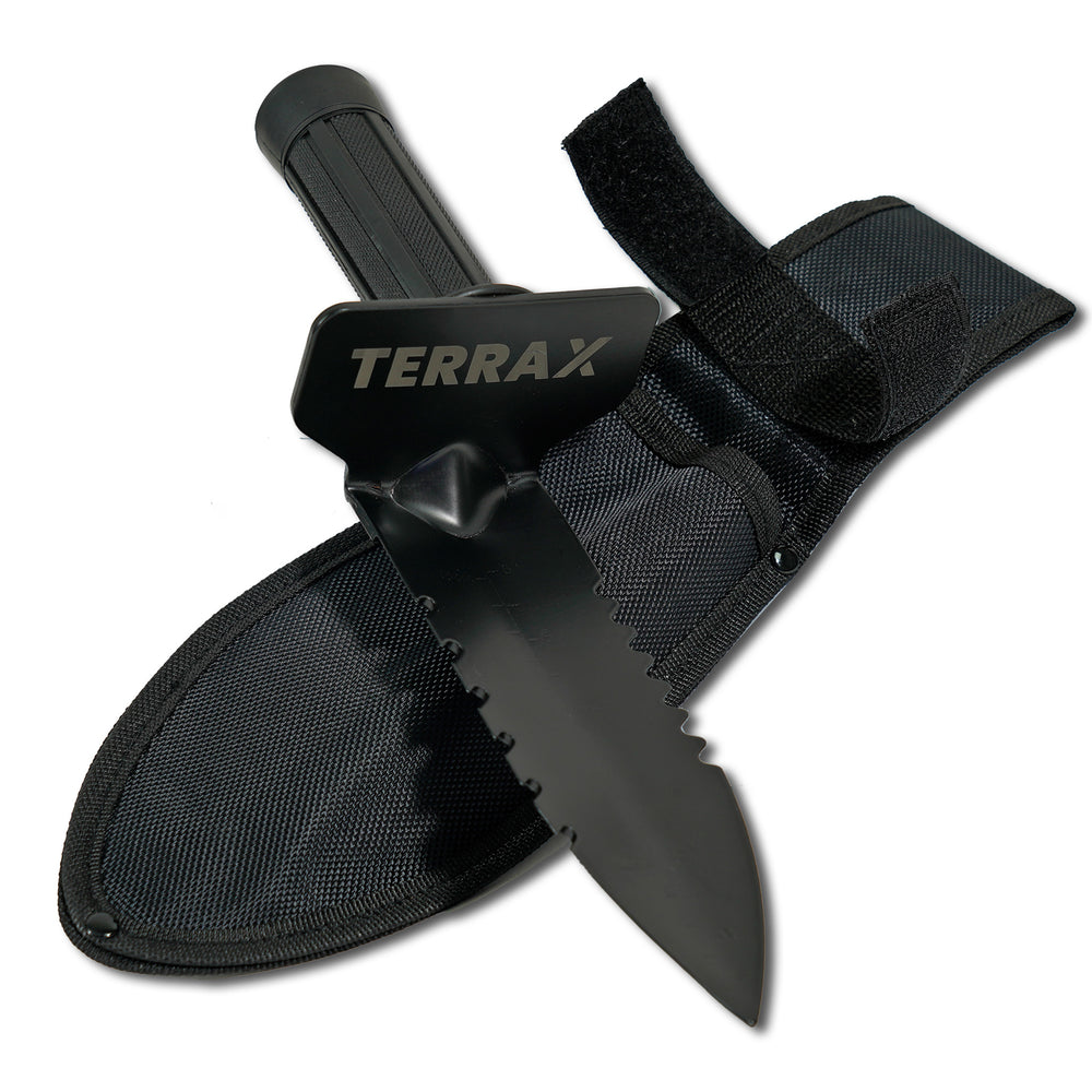 Elevate your outdoor pursuits with the TerraX Heavy Duty Hand Digger - Shovel with Serrated Edges, an essential tool for professional landscaping, gardening, relic hunting, metal detecting, and gold prospecting. Engineered with precision, this digging knife features a sleek black color and durable steel construction, ensuring reliability in various environments. Its serrated edges efficiently tackle a range of tasks, while the rubber handle provides long-lasting comfort. Weighing just 14 ounces, it offers a lightweight yet durable design. With the belted sheath included, you can conveniently carry and access your hand digger during outdoor adventures. Unleash its versatility and enjoy seamless outdoor exploration