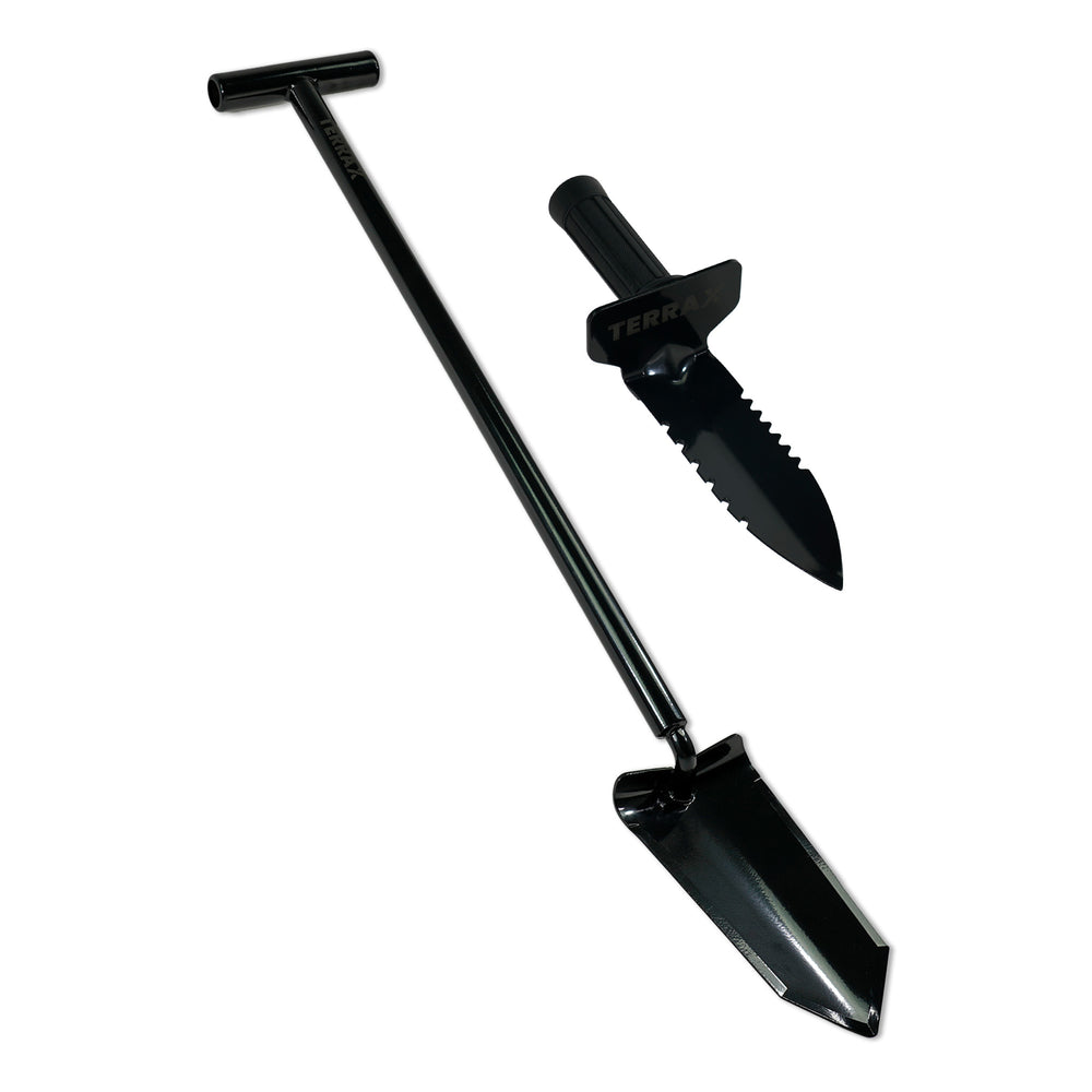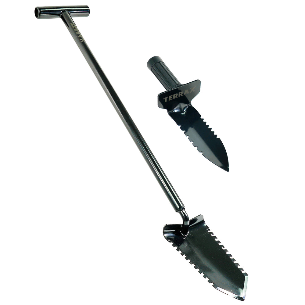 Uncover unparalleled efficiency and durability with the TerraX Master Digger Metal with 6-inch T-Handle Shovel, designed for professional landscaping, gardening, relic hunting, metal detecting, and more. The sleek black color and high-quality steel construction ensure longevity and reliability in various environments. The T-Handle is a generous length of 6 inches, ensuring a firm and secure grip, while the shovel is an overall length of 36 inches, providing optimal reach and control, while the 9.5-inch pre-sharpened edges deliver precision digging. The unique pre-sharpened edge style enhances performance, making it an ideal choice for efficient excavation.