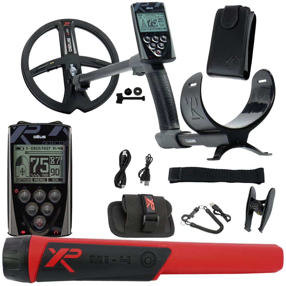 XP Deus Metal Detector with XP Deus MI-4 Pinpointer, 11″ X35 DD Waterproof Wireless Search Coil, Coil Cover, Wireless Remote Control Display Screen, Hip mount case for Remote Control, and a 5 Year Parts and Labor Warranty.