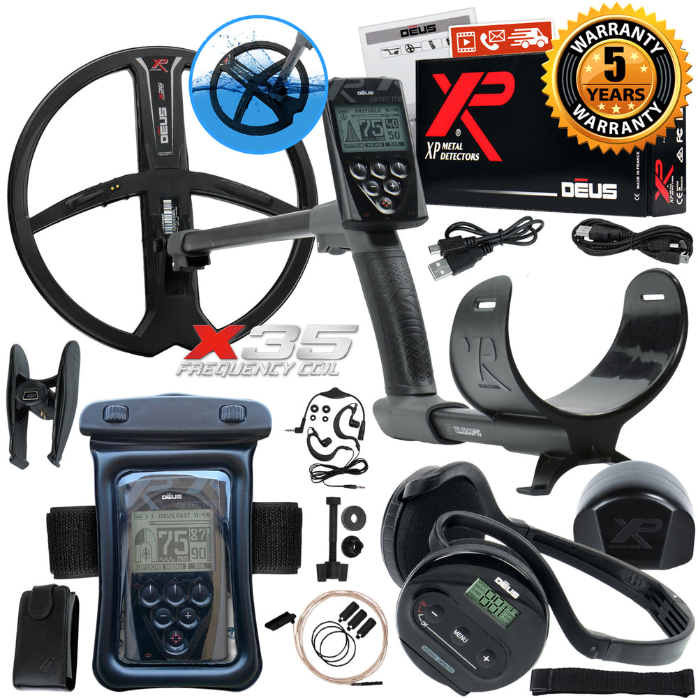 XP Deus Metal Detector Deep Gold & Relic Package with 11″ x 13″ X35 Large Deep Seeking Waterproof Search Coil, 11″ X35 DD Waterproof Wireless Search Coil, Coil Cover, WS4 Wireless Backphone Headphones with removeable electronic control, Headphone Storage Case, Wireless Remote Control Display Screen, Hip mount case for Wireless Remote, and a 5 Year Parts and Labor Warranty.
