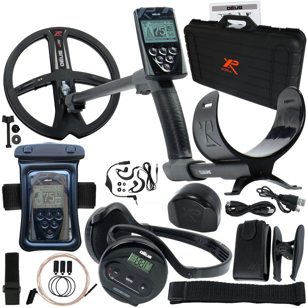 XP Deus Metal Detector with 9″ X35 DD Waterproof Wireless Search Coil, Hard Transport Case , Coil Cover, WS4 Wireless Backphone Headphones with removable electronic control, Waterproofing Kit (8 Foot Aerial Antenna, Waterproof Case, Waterproof Headphones, Volume Control), Headphone Storage Case, Wireless Remote Control Display Screen, Hip mount case for Remote Control, and a 5 Year Parts and Labor Warranty.