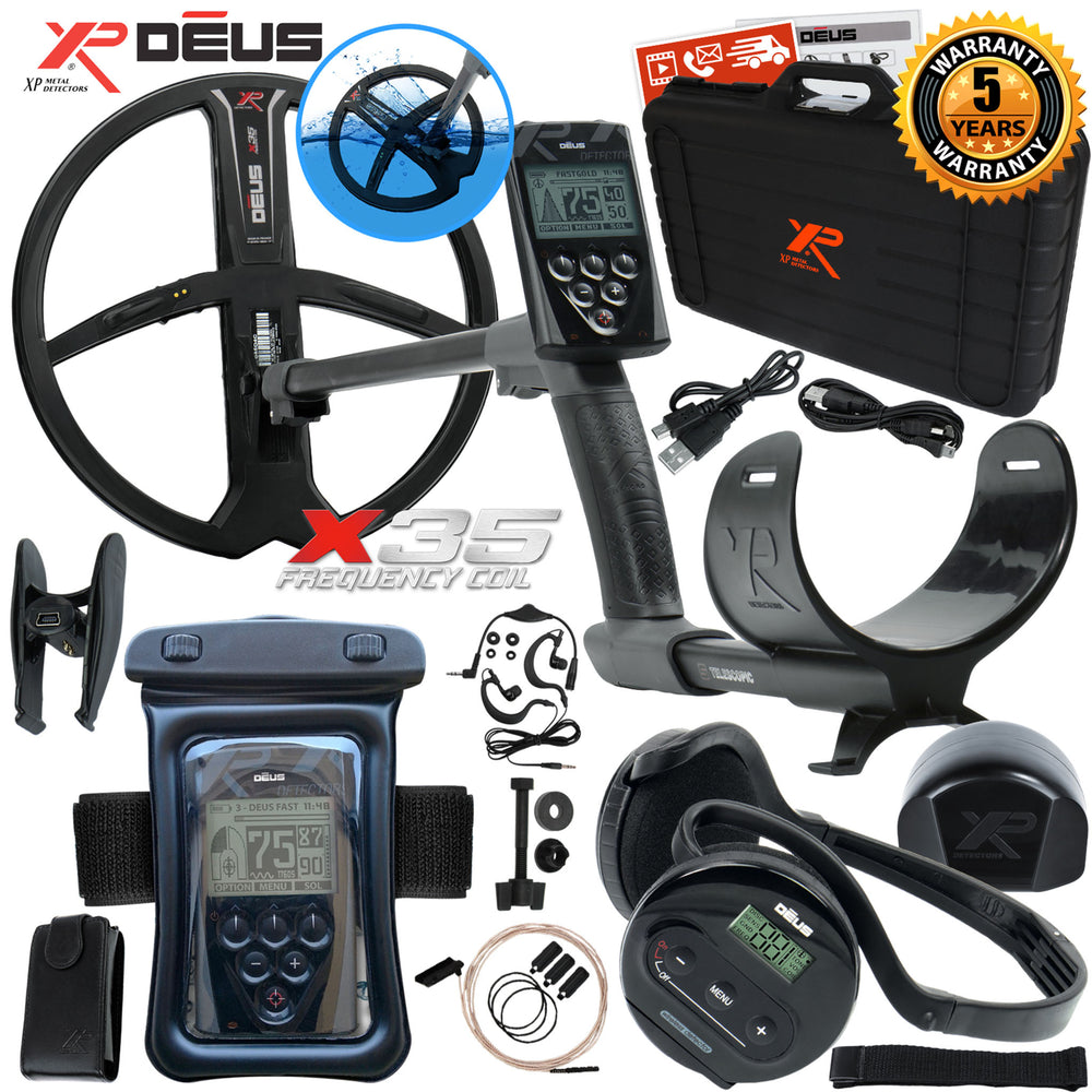 XP Deus Metal Detector with 11″ X35 DD Waterproof Wireless Search Coil, Coil Cover, Hard Transport Case, WS4 Wireless Backphone Headphones, Waterproofing Kit (8 Foot Aerial Antenna, Waterproof Case, Waterproof Headphones, Volume Control), Headphone Storage Case, Wireless Remote Control Display Screen, Hip mount case for Wireless Remote, and a 5 Year Parts and Labor Warranty.